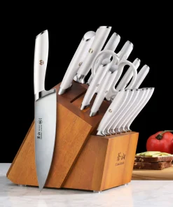 - 12 pièces : Fusil à aiguiser (2,3cm/8p), couteau de chef (20,3cm/18p), Santoku (12,7cm/5p), 6 couteaux à steak (12,7cm/5p), couteau à larder (8,9cm/3,5p), ciseaux (20,3cm/8p), bloc pour couteau en acacia