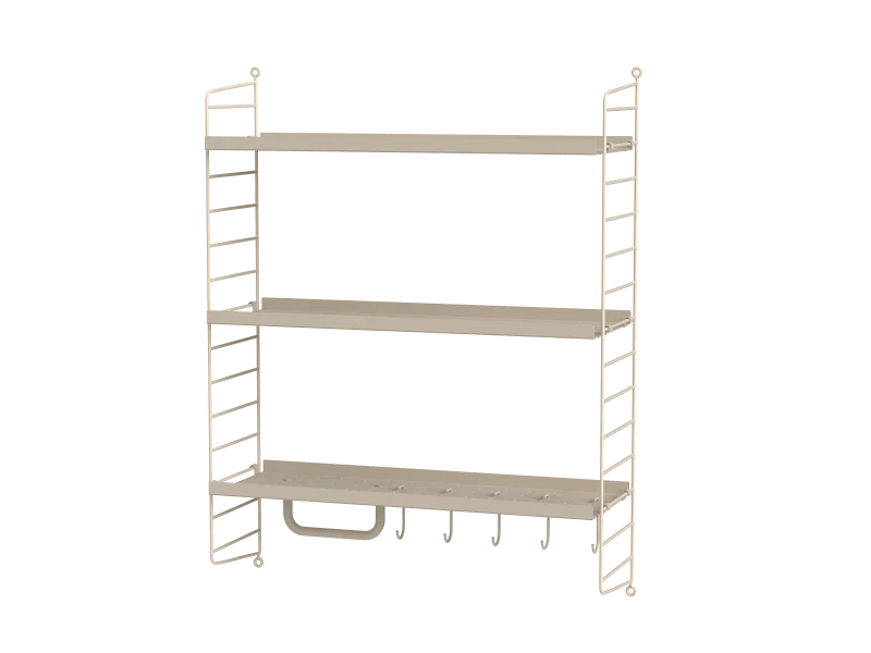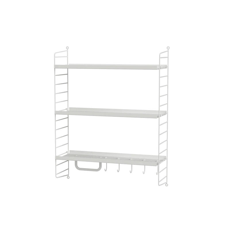 String vous propose ici une étagère créée pour la salle de bain. Elle est idéale pour ranger vos produits de beauté, crème, maquillage. Le rail et les crochets vous permettent de suspendre vos articles de toilette.
