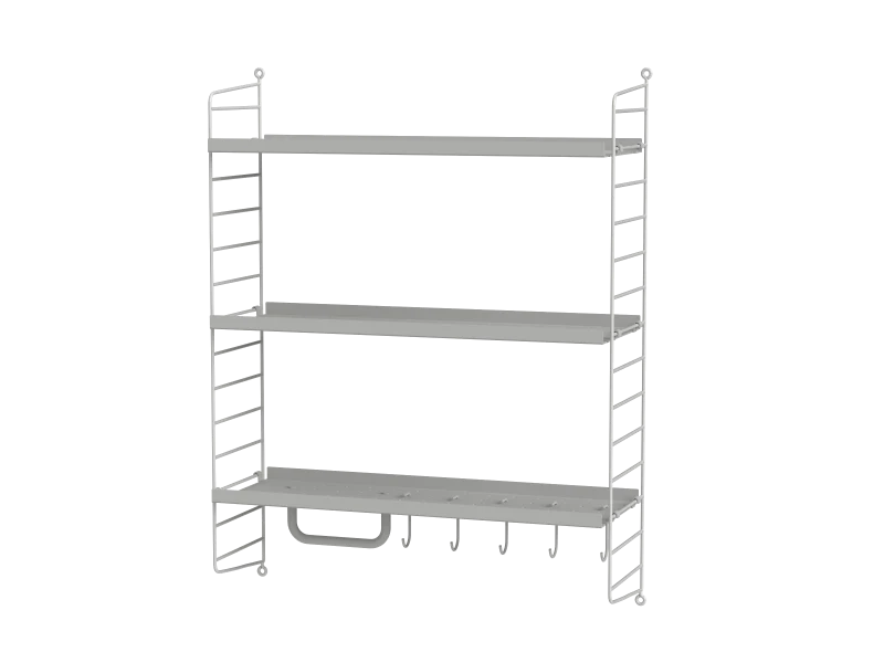La gamme String s’est enrichie au fil des années: les tablettes et montants métalliques ont été déclinés en divers coloris et équipés de nouveaux accessoires (porte-journaux, tables pliantes, cabinets aux portes coulissantes, étagères avec récipients ou plateaux de bureau).