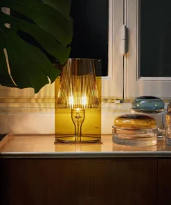 L’icône classique de la lampe de chevet est revisitée par la technologie de Kartell pour devenir un produit industriel dans une variété de nuances de couleurs. La forme de Take est le résultat de l’union de deux parties spéculaires : deux feuilles plates et rectangulaires qui, de bidimensionnelles au centre, prennent la forme et le volume d’une « demi-lampe ». Le plissage interne du diffuseur embellit l’objet en créant, lorsqu’il est allumé, un jeu de reflets.