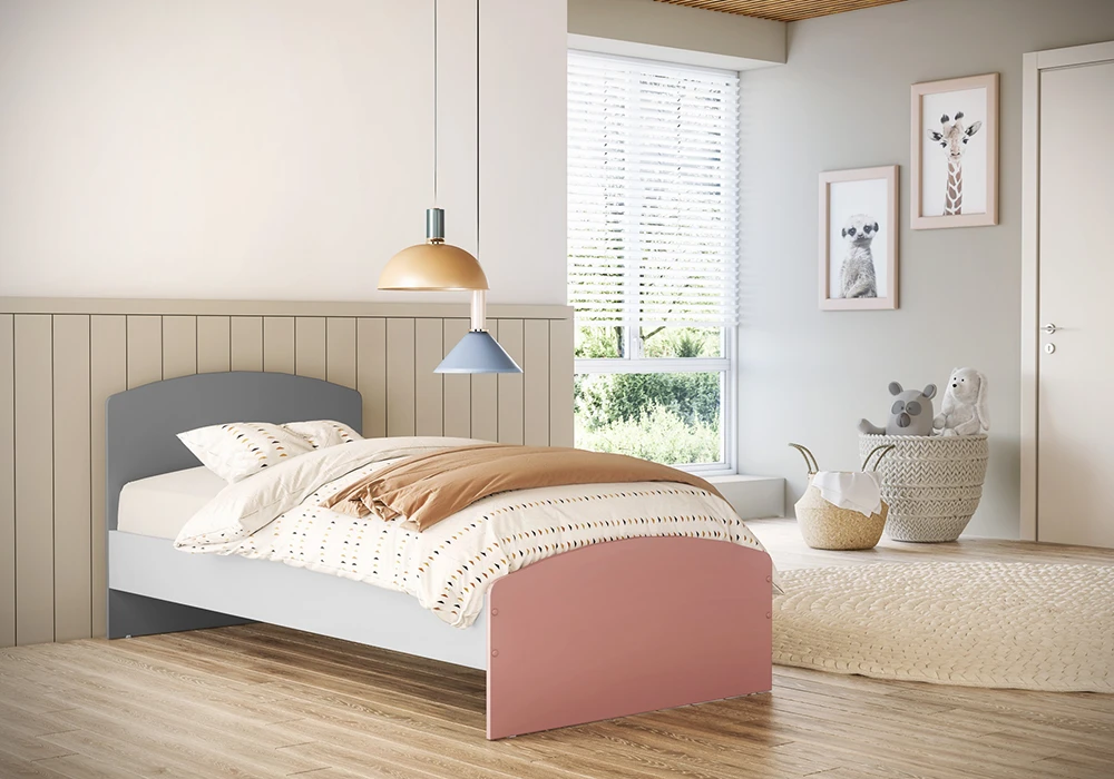 Structure en panneau de particules, recouvert de papier couleur gris, blanc ou rose. Lit vendu AVEC SOMMIER, SANS MATELAS.