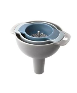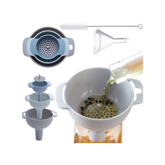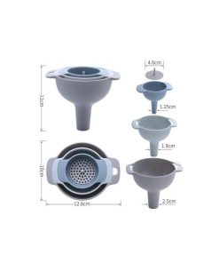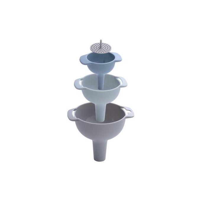 Les entonnoirs sont combinés en un pour économiser de l’espace de stockage et sont équipés de deux puissants crochets à ventouse pour un rangement facile dans les armoires de cuisine.
