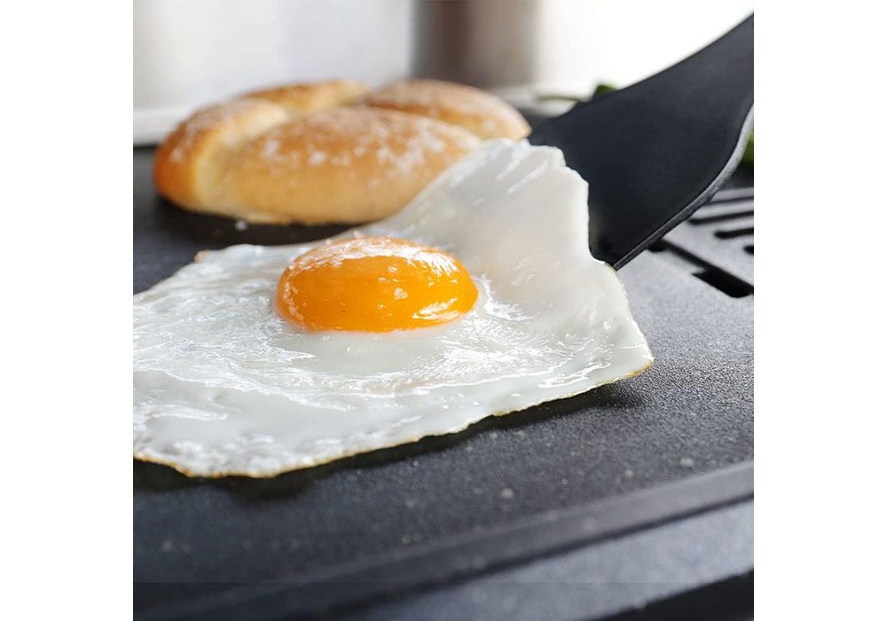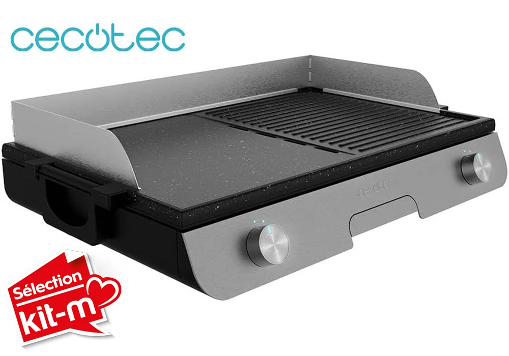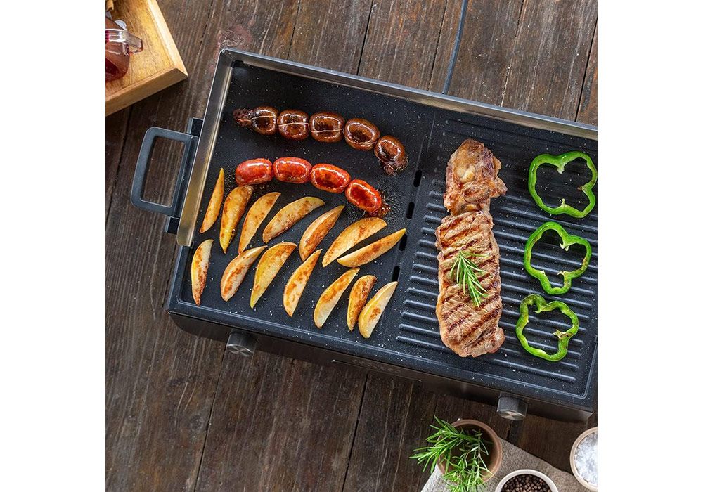 - Surface mixte gril et plancha pour cuisiner des viandes, des légumes, des œufs frits, des fruits de mer ou du poisson.